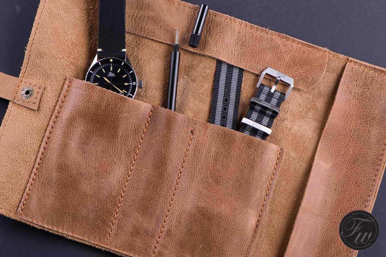The Eza Sealander will be delivered in a high gloss watch box and inside you’ll find a high quality leather watch roll with the watch, additional straps and a changing tool. Later on this month there will be an official launch of the Eza Sealander and orders will be taken from that moment on.