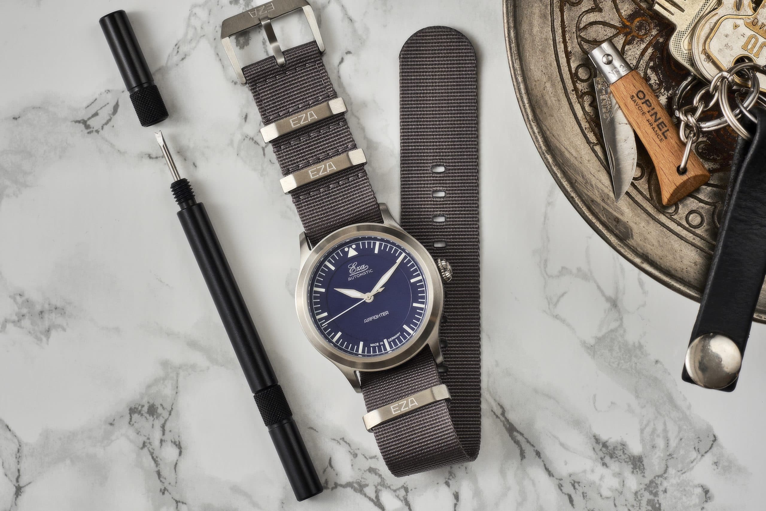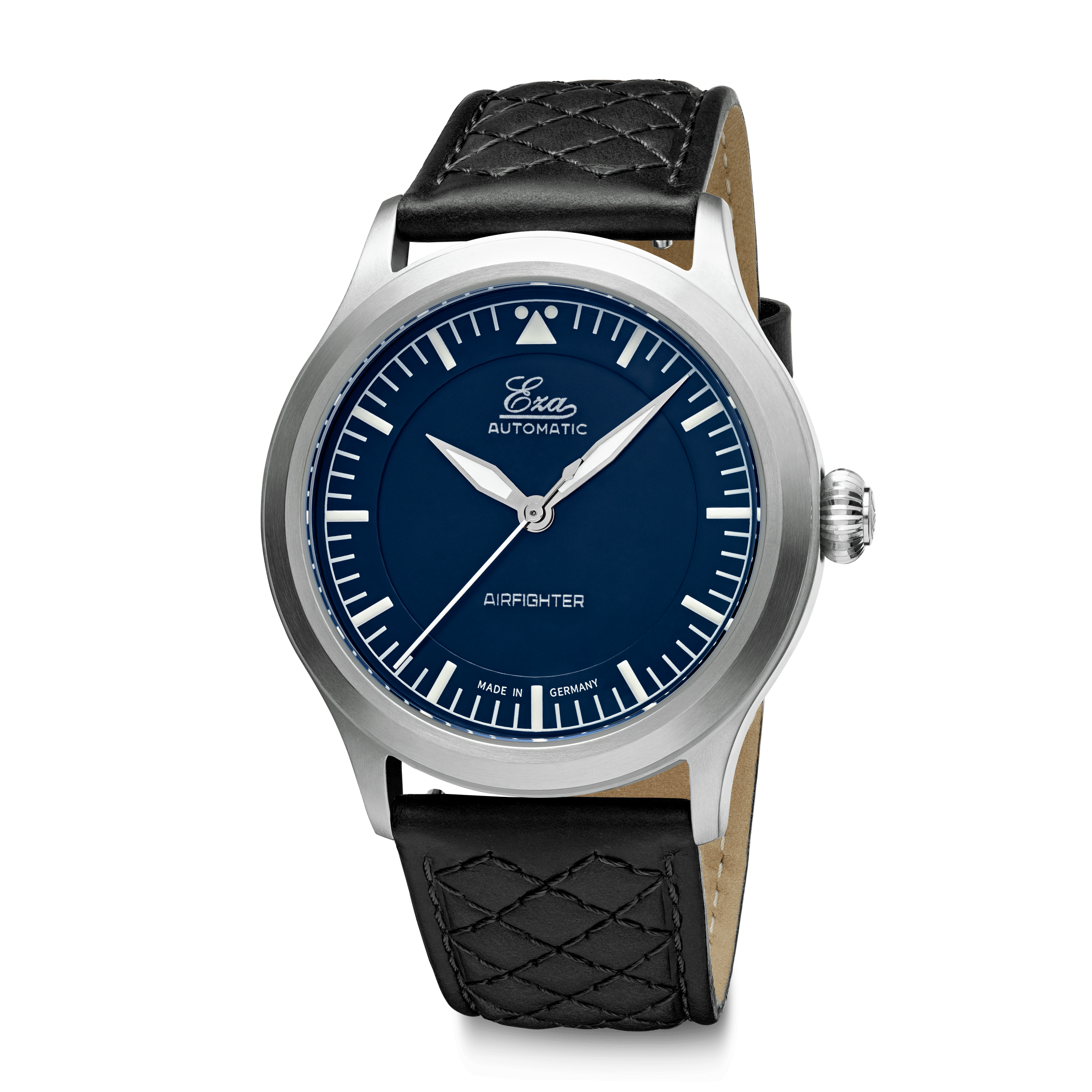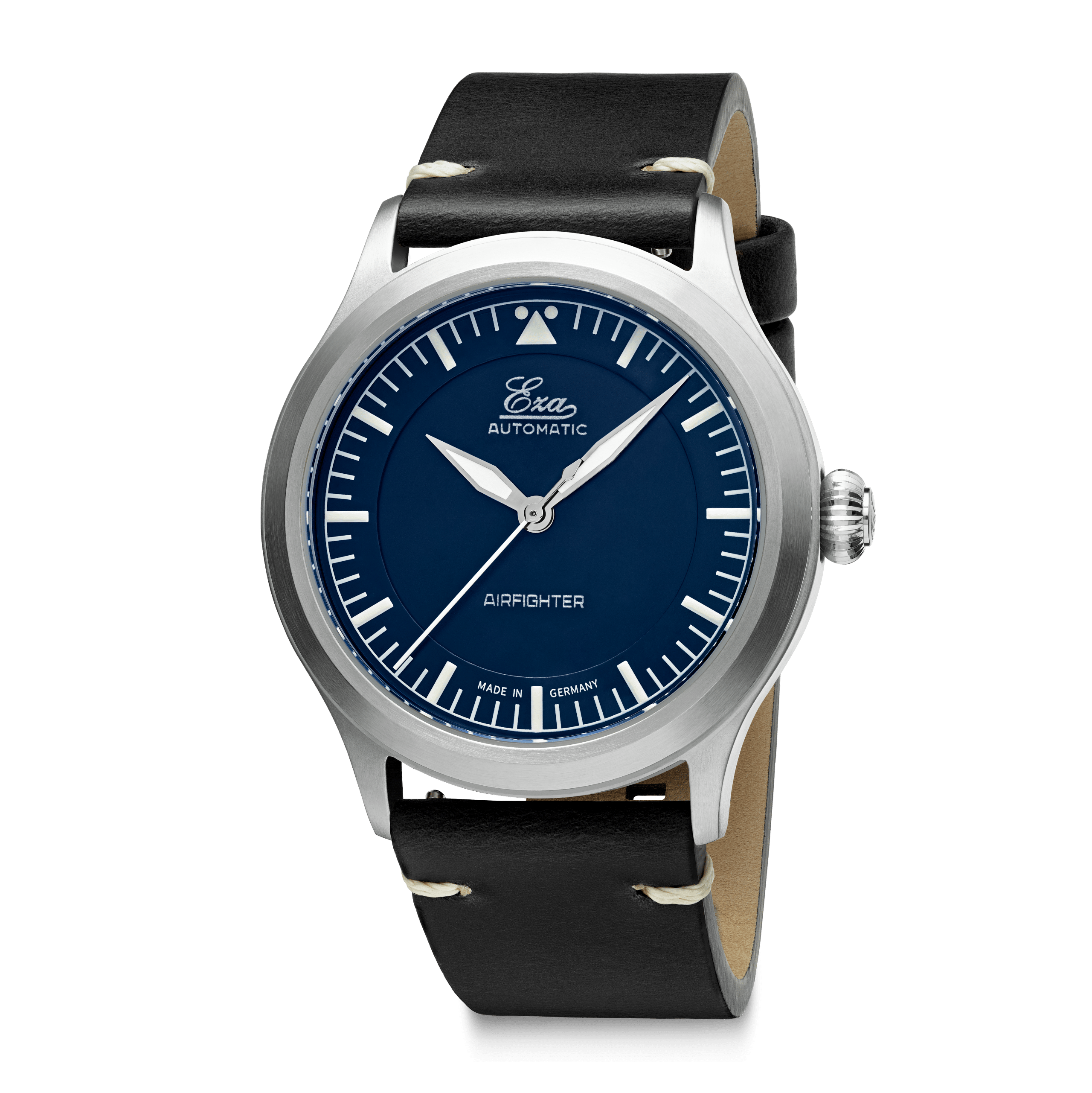 This is the Eza AirFighter a modern interpretation of the classic military issued pilot watches with some subtle details. The Eza AirFighter has a stylish appearance with its brushed finish and narrow high gloss finish on the side. Inside the AirFighter you will find a Swiss automatic movement, caliber SW-200, that is adjusted to six positions.