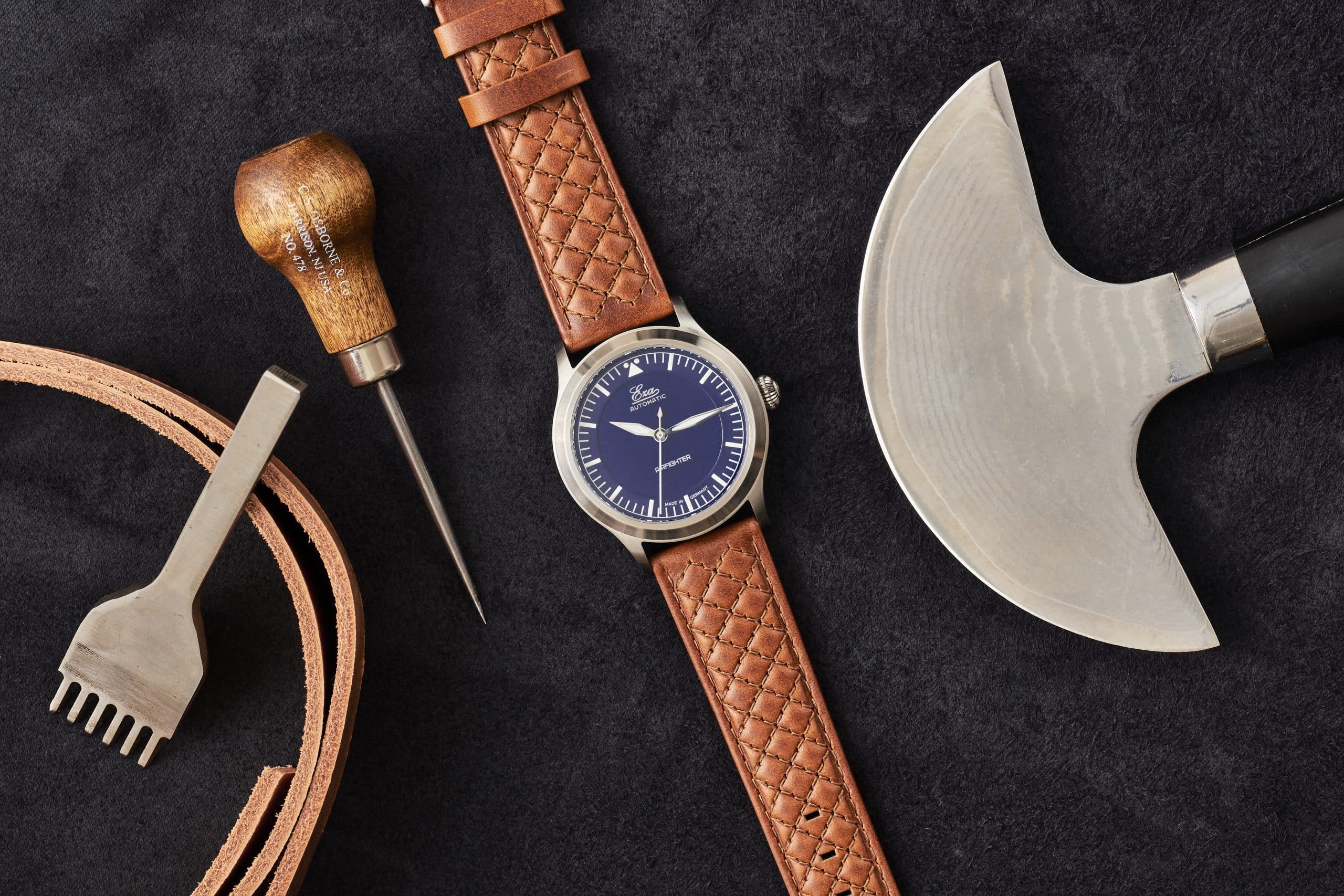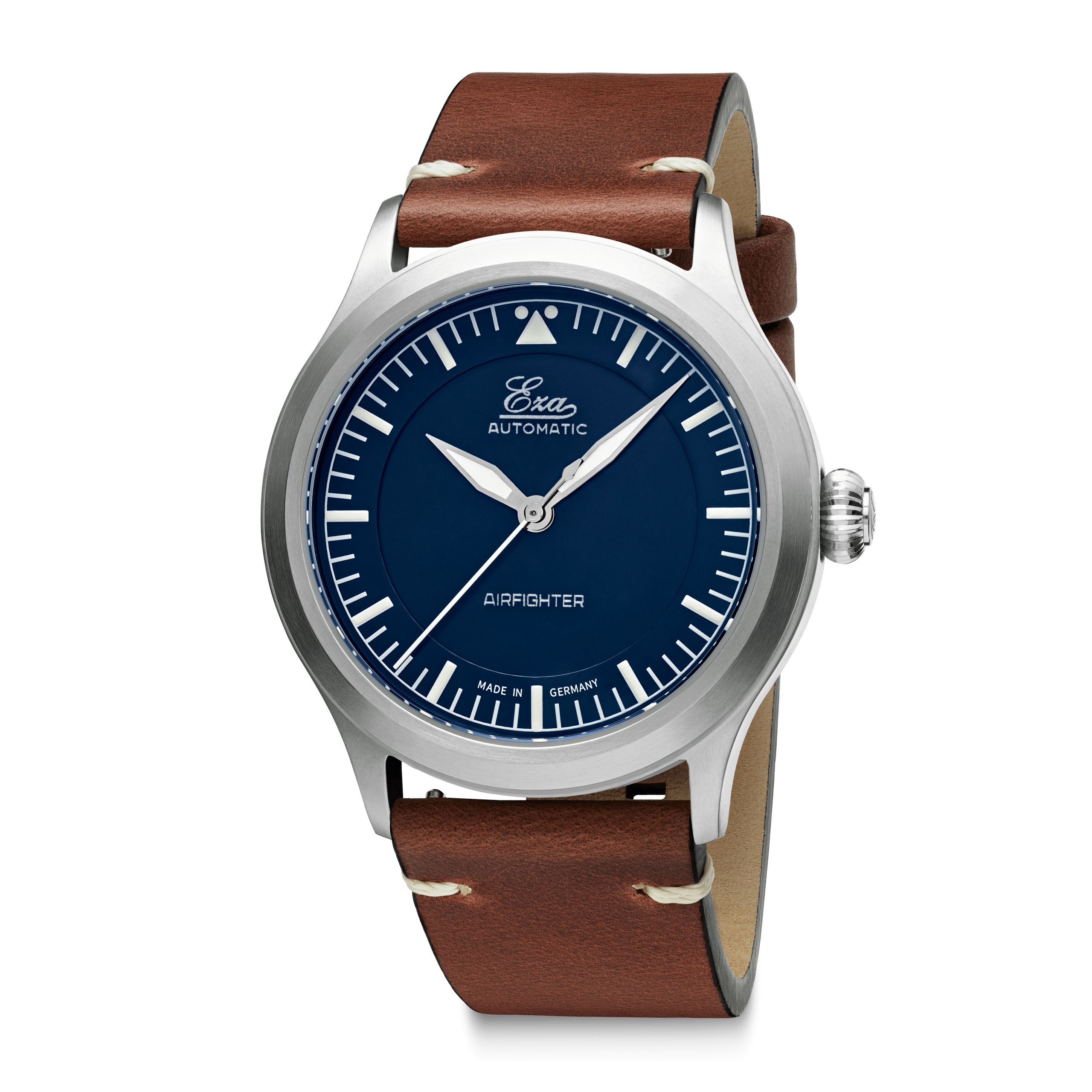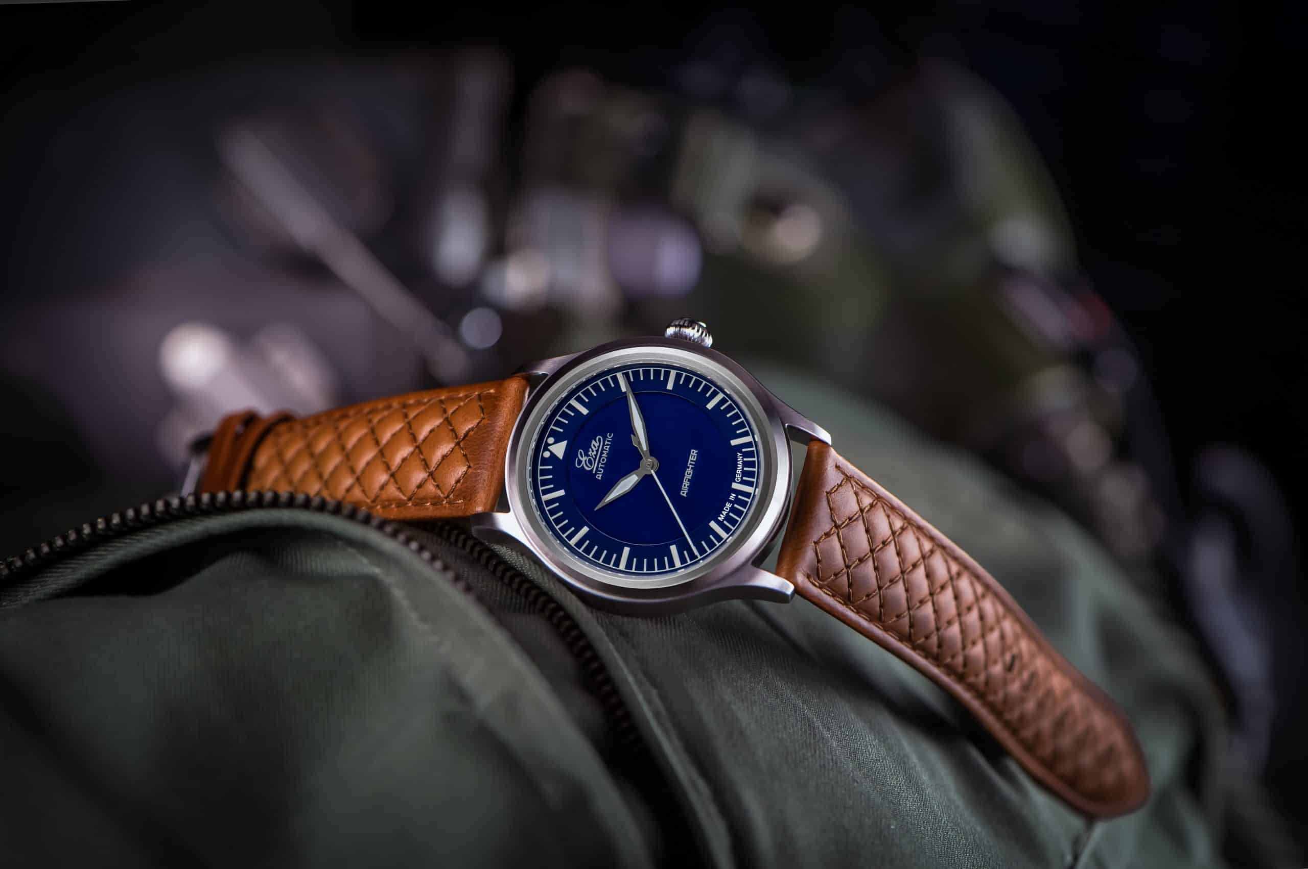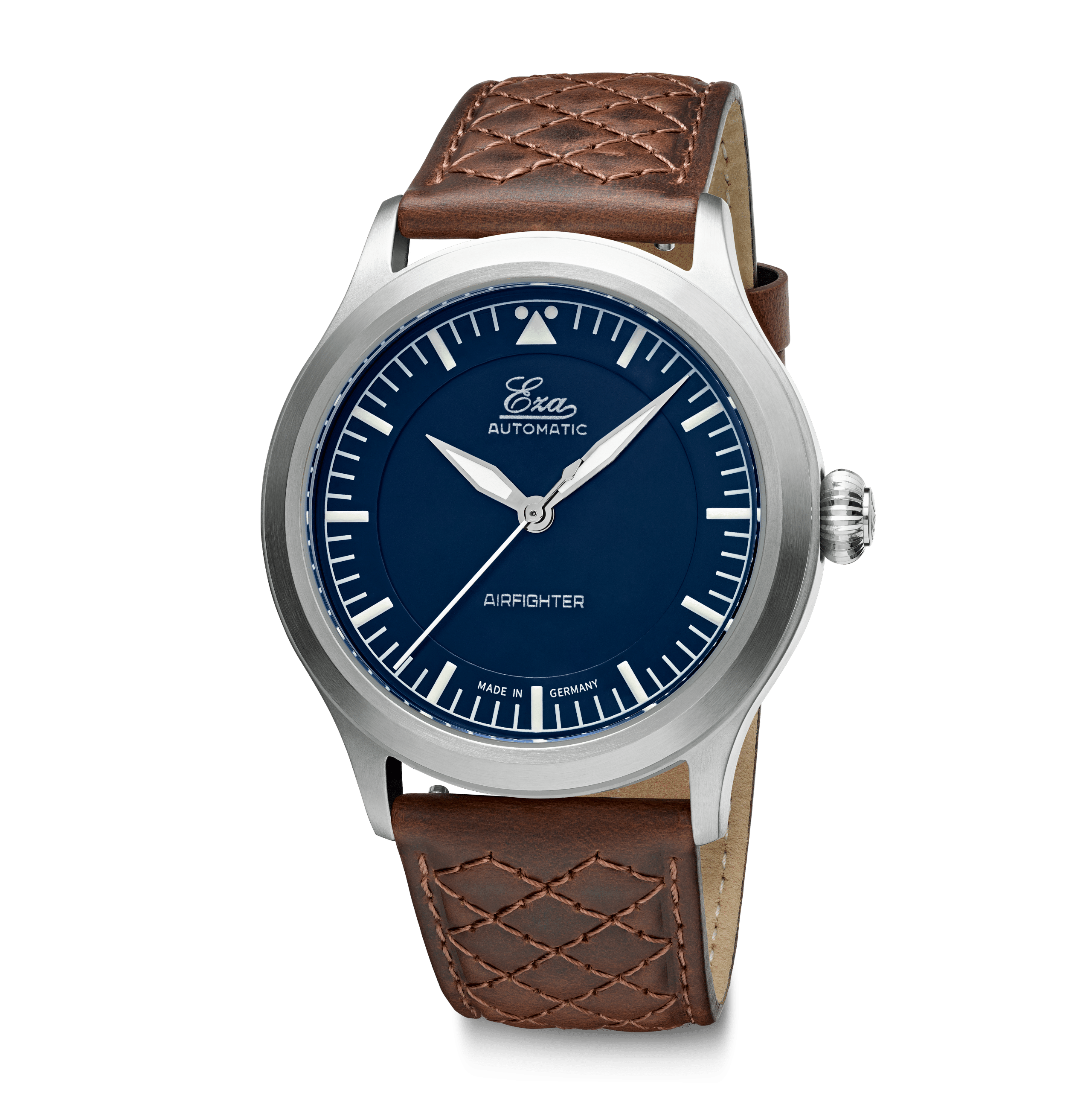 This is the Eza AirFighter a modern interpretation of the classic military issued pilot watches with some subtle details. The Eza AirFighter has a stylish appearance with its brushed finish and narrow high gloss finish on the side. Inside the AirFighter you will find a Swiss automatic movement, caliber SW-200, that is adjusted to six positions.